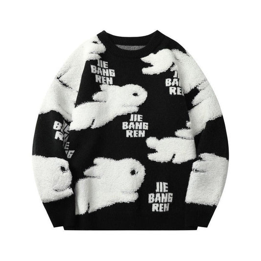 Cheng: Harajuku Couple Rabbit Sweater Jacket Red Loose Knit Sweater Jacket Fashion striped oversized sweater mens clothes pullover