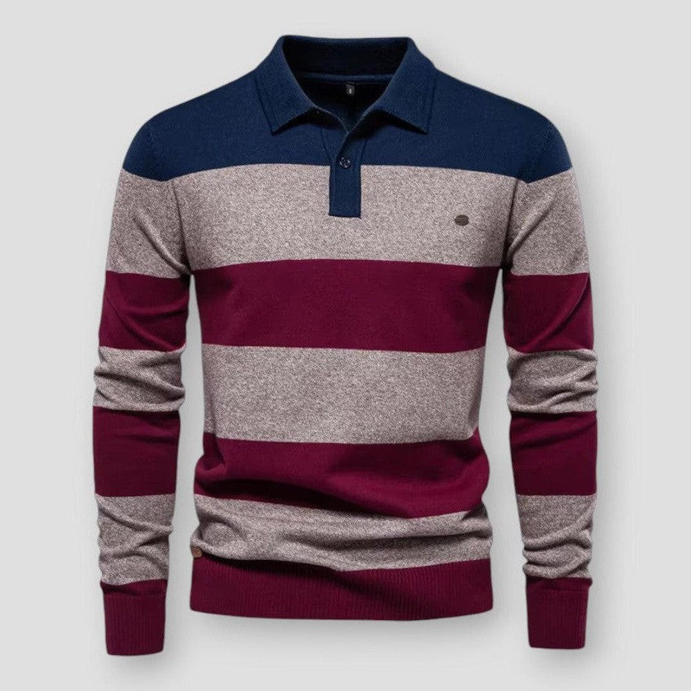 A refined stripe cotton knit with a button-up polo collar, merging effortless style with a classic touch. Ideal for layering, this versatile sweater adds a modern edge to your everyday essentials.