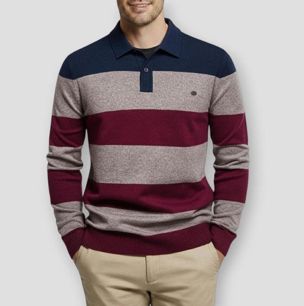 Combines classic style with modern sophistication. This slim-fit sweater features a polo collar with a sleek lapel design, enhanced by striped stitching that adds a touch of contemporary flair. This sweater effortlessly elevates your wardrobe with its refined yet relaxed style.